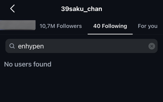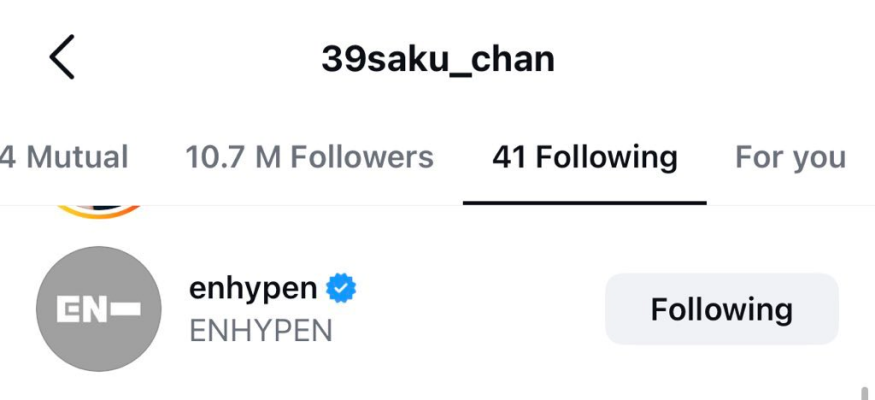 不過,截至3日,目前查看她的追蹤清單時,已無法看到「ENHYPEN」的官方帳號,似乎已經取消追蹤。這是否是無心的誤操作或是短暫性的測試行為,尚無法確定,但也因此引發了粉絲之間的諸多揣測。