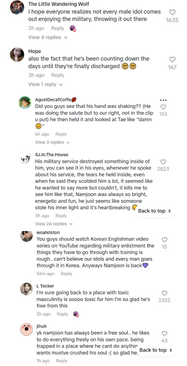 「他的軍旅生活摧毀了他內在的一些東西,每當他談論服役時,你都能從他的眼睛裡看出來,甚至當他們訓斥他很多次的時候,他似乎想說更多卻又不能說,這讓我心碎,南俊總是那麼陽光、充滿活力和有趣,他現在看起來就像有人偷走了他內在的光芒,這讓人心碎😔」