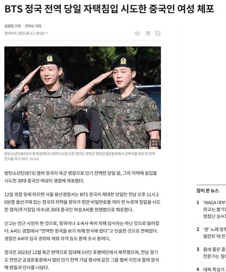 根據韓國時間6月12日的媒體報導,一名30多歲的中國籍女子在試圖闖入BTS成員田柾國住家後,遭到警方逮捕。