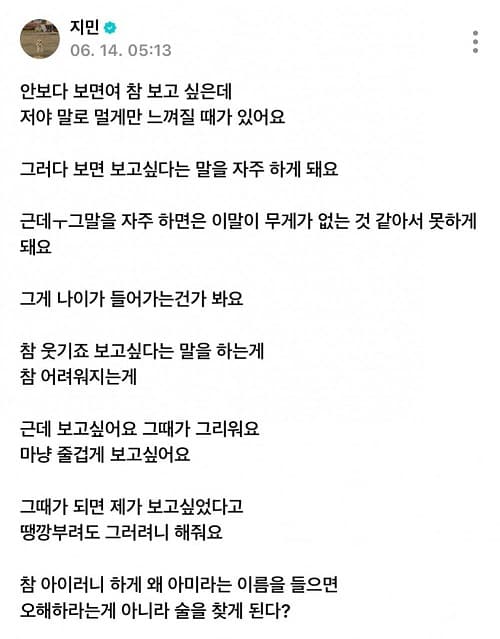 BTS成員智旻近日在粉絲平台Weverse上向粉絲們發表了一系列真誠的訊息,表達了他深切的感情,以及在團體休團期間與粉絲保持連結的想法。
