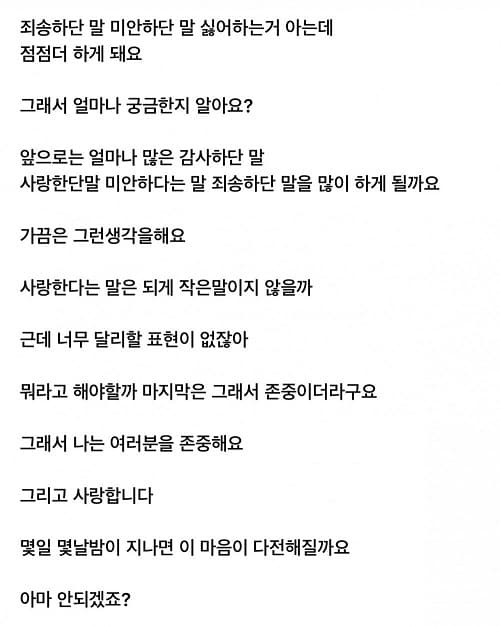 智旻也坦率地談到了愛與尊重,他寫道:「說『我愛你』看似微不足道,但最終它會引導到『尊重』這個詞。這就是為什麼我尊重並愛你們。」他的話語強烈地引起了粉絲們的共鳴,突顯了他與粉絲之間深厚的情感連結和感激之情。
