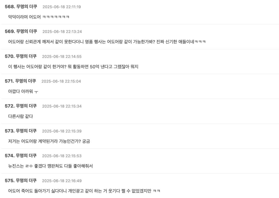 「他們說什麼惡毒公司ADORㅋㅋㅋㅋㅋㅋㅋ」「說跟 ADOR 的信任關係已經破裂了不能一起合作,結果名牌活動又能跟 ADOR 一起?真是神奇的孩子們ㅋㅋㅋ」