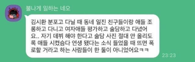 「當金時煥在文浦高中讀書時,他和不良少年混在一起,嘲笑其他同學,對女生做出評分,還喝酒、抽菸……他還要別人不要上傳他抽菸喝酒的照片,說自己要出道。我們聽說他成為練習生時,不止一個人想要揭露他,哈哈。」