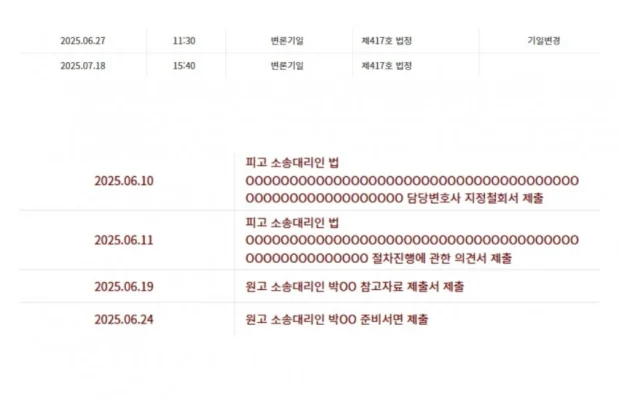 「OOOO」部分很可能是律師的名字。下方欄位則寫著「原告訴訟代理人朴OO參考資料提交書提交」、「原告訴訟代理人朴OO準備書面提交」,律師姓名均以「OO」隱藏。