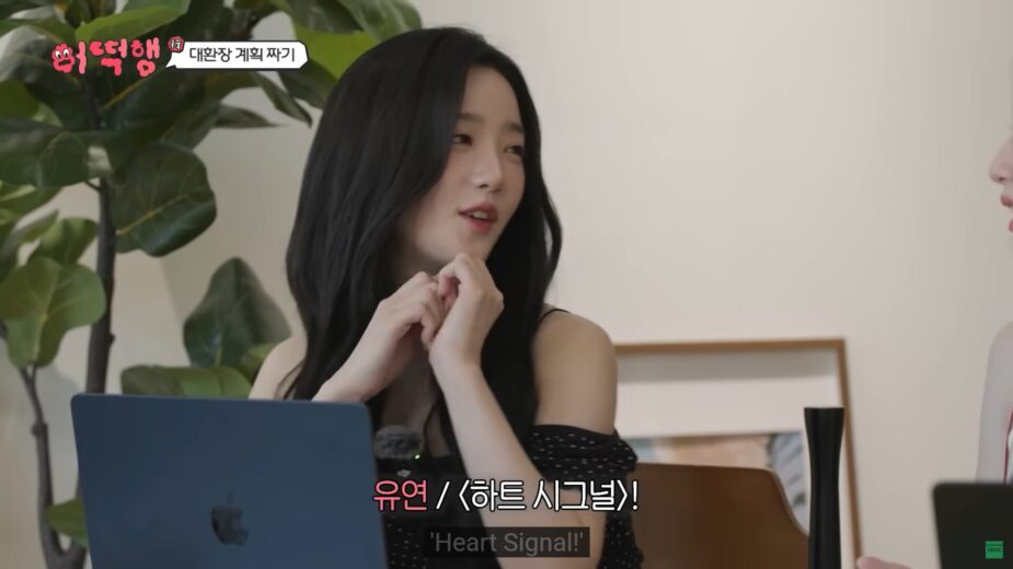 這位i-dle成員接著表示好奇自己適合參加哪一種戀愛節目。當琉然建議她參加《Heart Signal》時,她拒絕了,理由是自己不喜歡「一夜情」,而這正是該節目的主要內容。