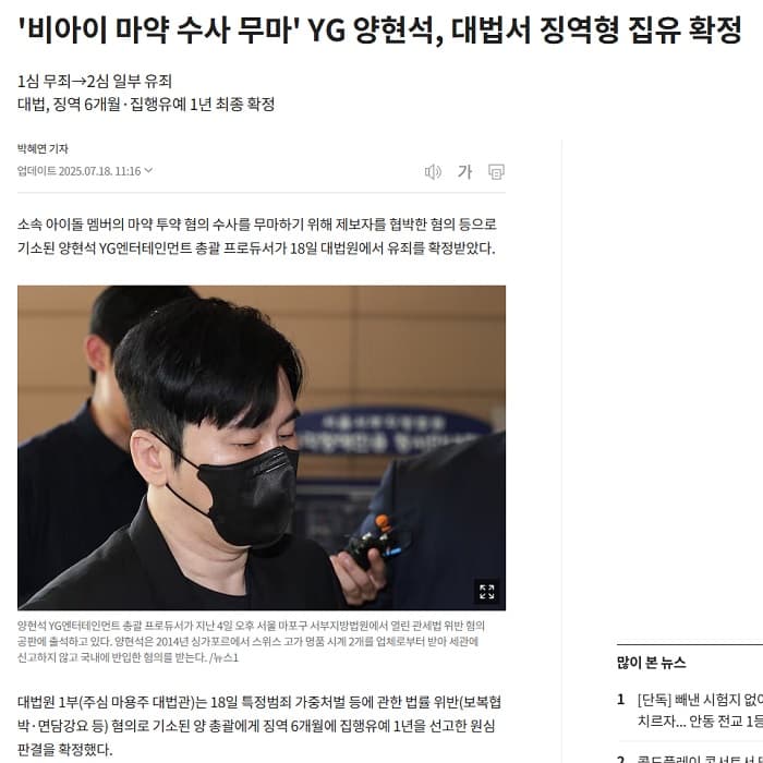 YG梁鉉錫因掩蓋B.I的毒品事件確定有罪!判處6個月徒刑,緩刑1年