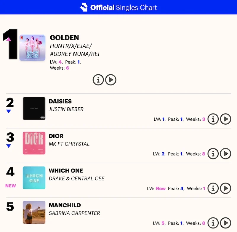 根據Official Charts的資料,歌曲《Golden》在最新單曲排行榜中登上榜首。Official Charts指出:「K-POP 13年來首次奪冠,這是自PSY的《江南 Style》(2012年10月)以來,首次K-POP歌曲登上冠軍。」