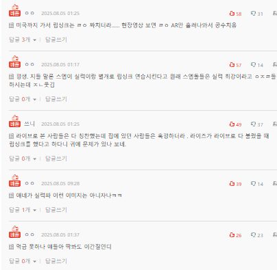 韓網友在該貼文的留言區也毫不留情。有些人為RIIZE辯護,但更多人則將矛頭指向SM娛樂,批評公司無論偶像唱功如何,都要求他們在音樂節假唱。考量到SM旗下藝人被視為業界最佳歌手,許多粉絲因此感到失望。