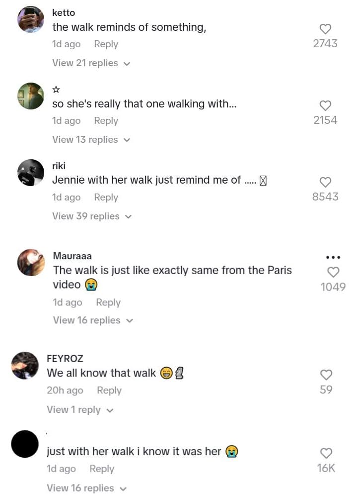 雖然偶像外出被拍到並瘋傳並不罕見,但留言區充滿了表示Jennie的走路姿勢讓人想起那段疑似她與V的爆紅影片,有粉絲甚至說這是該影片真實存在的「證據」。