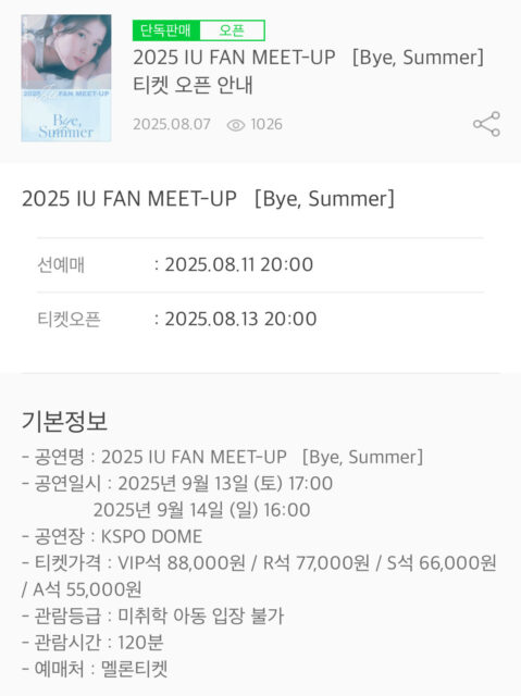 IU因即將於2025年在KSPO Dome舉辦的「IU FAN MEET-UP [Bye, Summer]」活動門票價格驚人親民而在網路上獲得大量讚譽。