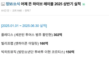 擁有眾多K-POP偶像團體的HYBE,其2025年上半期(1月~6月)各子公司業績已公開。