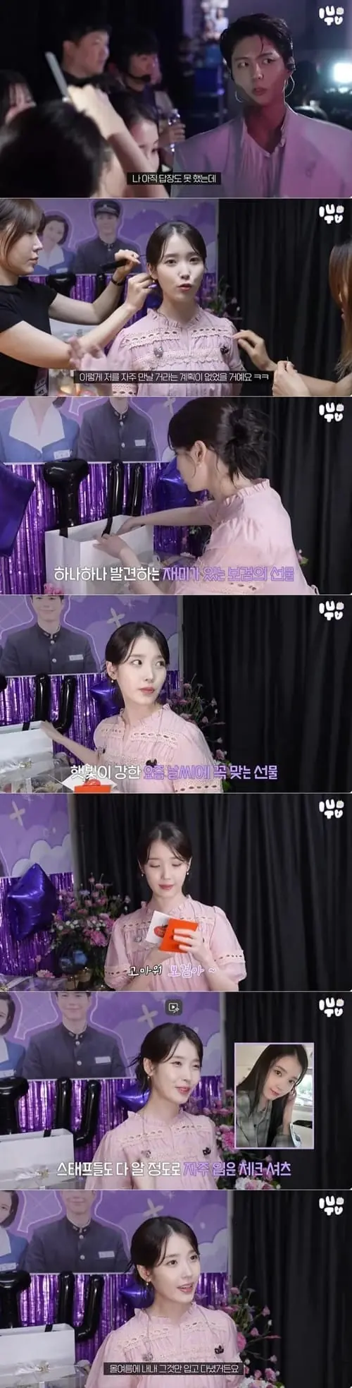 之後,她參觀了朴寶劍為她準備的豪華休息室。IU說道:「他不是那種忽略細節的人。這個(購物袋裡的禮物)是一頂帽子。他說我應該在強烈的陽光下戴著。謝謝你,寶劍。」