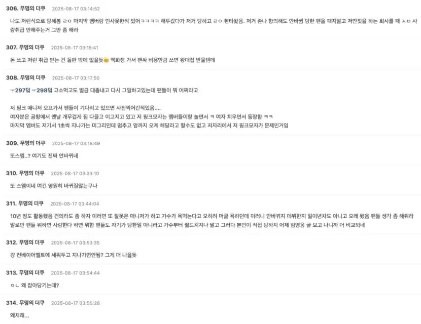 「如果都活動快10年了,偶像本人遇到這種情況至少也該提出建議吧。每次都是經紀人/工作人員搞砸,最後挨罵的是藝人,難怪什麼都不會變。他們又不是才出道一兩年——想想你們的粉絲吧。嘴上說『我們愛你們』有什麼用,行動根本對不上?還有粉絲們,別因為沒有發生在你身上就替藝人護航。等到有一天輪到你,你就知道。昨天看到那篇關於林英雄對粉絲待遇的貼文,對比之下更明顯了。」