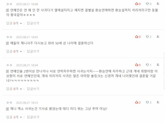 「藝人只要見兩次以上、常常聯絡就等於在交往——也老是換乘戀愛。而且他們的喜好和理想型本來就是藝人;不管他們彼此怎樣,ARMY和BLINK就別操心了。你覺得他們這把年紀會結婚嗎?ㅋㅋㅋㅋㅋㅋ」「我記得看過Jennie和EXO交往的報導,但Teddy、GD、V那些不就是傳聞嗎?」