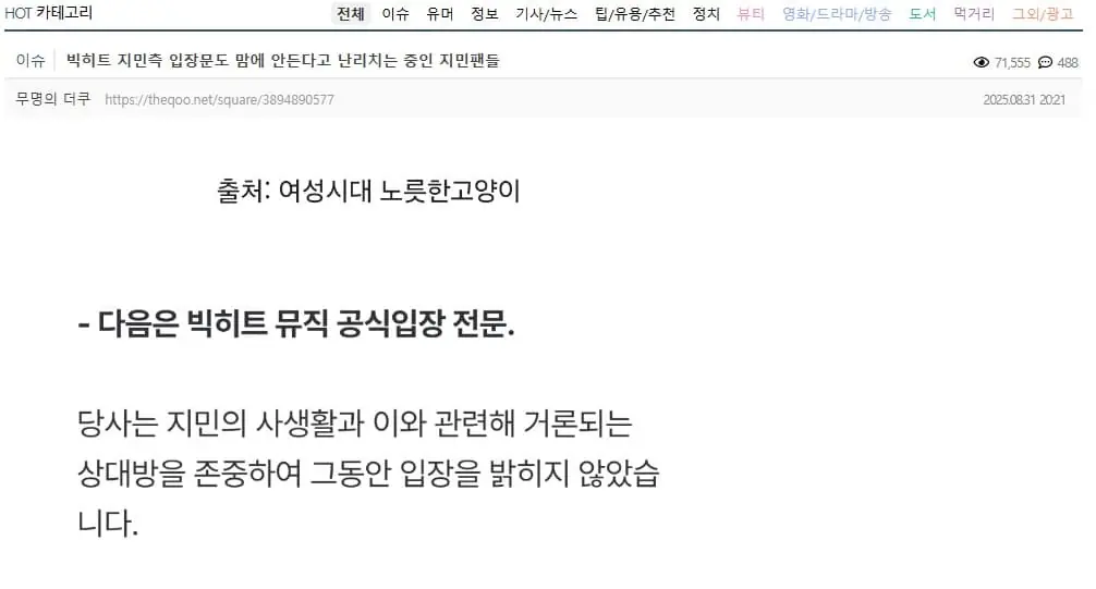 也有網友認為,既然BIGHIT MUSIC已經代表藝人發聲,接下來就該由智旻本人來回應。另一些人則補充,「大家都有責任」,這場風波是「各方共同造成的」,包括粉絲、兩位當事藝人與公司。