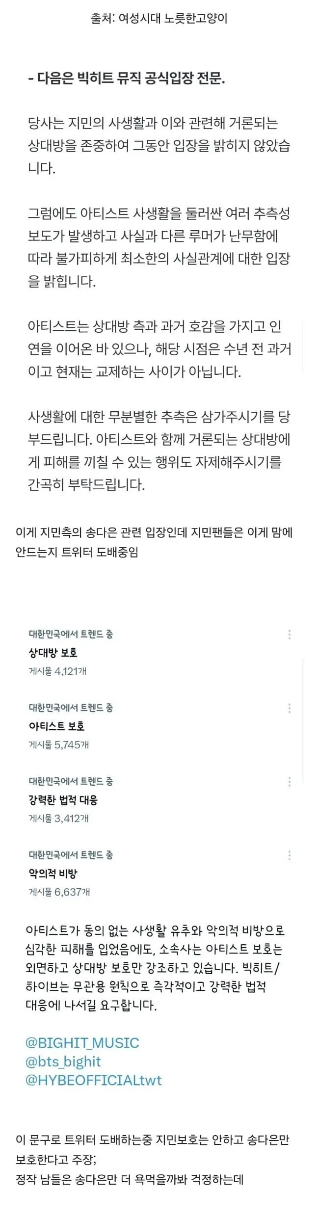 「儘管藝人因未經授權的私生活揣測與惡意誹謗而遭受嚴重傷害,經紀公司卻忽視對藝人的保護,只強調對另一方的保護。我們要求BIGHIT/HYBE依零容忍原則,立即採取強而有力的法律行動。」
