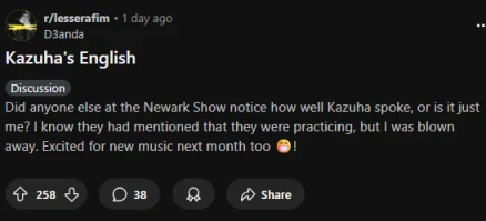 這段全英文致詞也在Reddit上引發關注。除了稱讚她願意直接用當地語言向粉絲傳達心意之外,許多海外粉絲也對她的英語實力感到驚艷,「好到嚇一跳」。