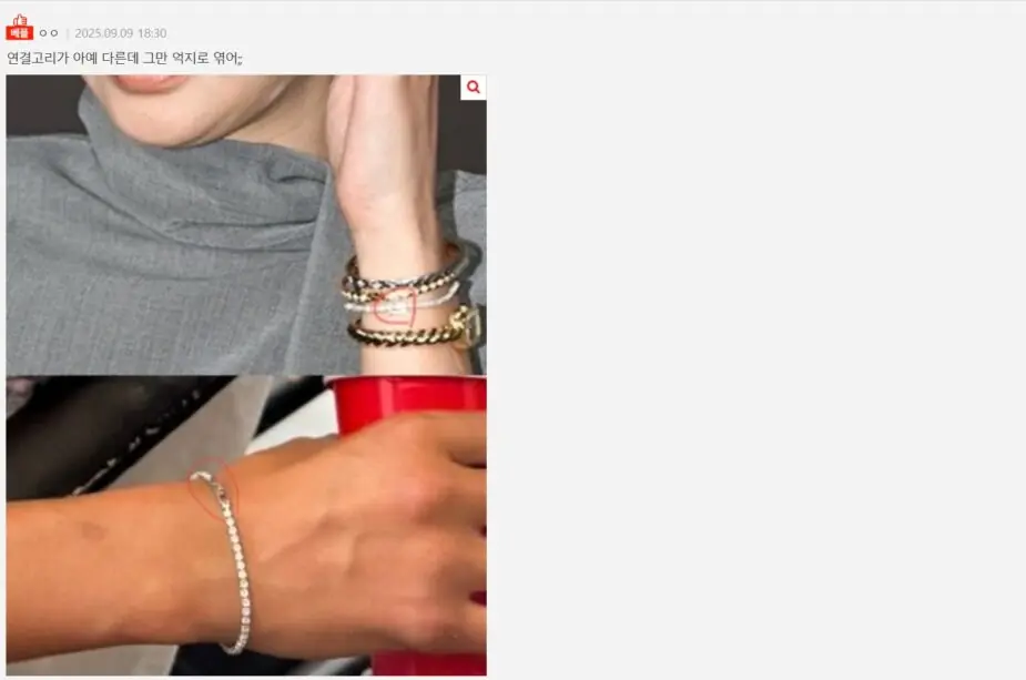 這則韓網爆紅貼文聚焦於她與Nico Hiraga被指配戴「同款Cartier手環」的疑點。