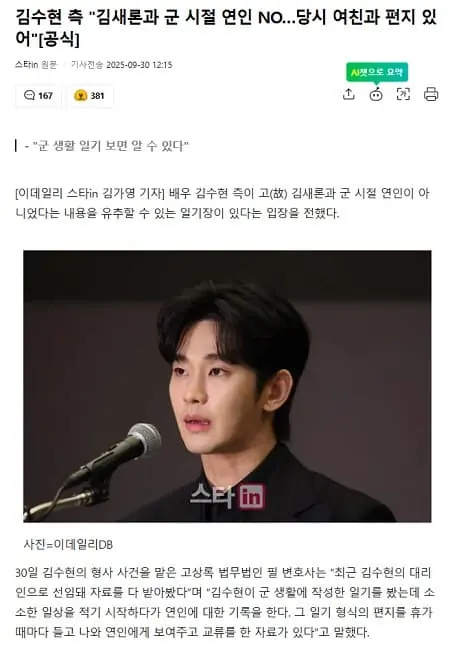 據Phil Law Firm的高相祿(Ko Sang Rok)律師表示,金秀賢自2017年10月入伍後,只要在服役期間一有空檔,就會寫信給自己的戀人。