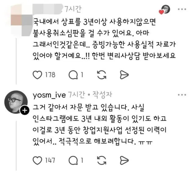 網友留言:其實在韓國,如果商標超過3年未使用,就有人可以提起不使用撤銷審判。我想大概就是在講這件事……你需要可驗證的持續使用證據!請務必諮詢律師。