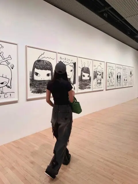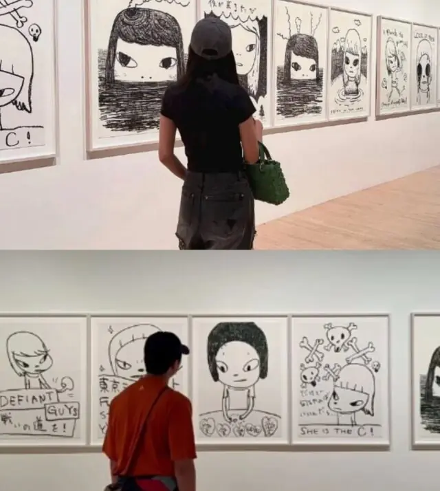 第一組照片顯示,RM與Jisoo都在普賽爾屋(Southbank Center)欣賞藝術家奈良美智的作品。