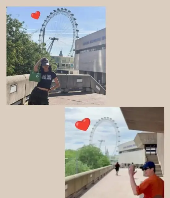 在博物館照片之後,原PO又貼出兩位偶像在英國「倫敦眼」前的照片。雖然兩張都沒有特別出現愛心符號之類的元素,但顯示了兩人拍照時所在位置與取景角度的相似之處。