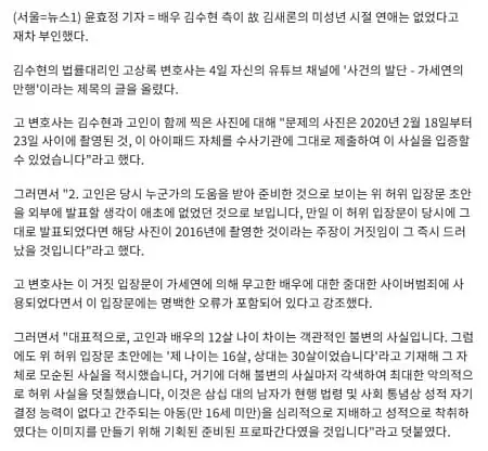 關於外界稱已故女演員曾撰寫、並在聊天中提及的那份「聲明草稿」,高尚錫主張那是虛假文件,顯然有外部協助、且從未意圖發表;他援引金賽綸曾發給某記者的訊息——「文章真的不會刊出、事情已解決了嗎?我很不安」——作為她並不打算公開該文的證據。