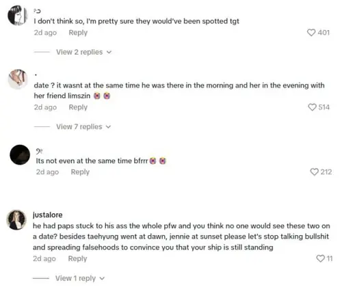 「整個巴黎時裝週都有狗仔黏著他屁股後面,你覺得還會沒人看到他們去約會嗎?再說,金泰亨是清晨去的,Jennie是傍晚。拜託別再胡說八道、為了說服自己你的CP還能站就散播假消息了。」