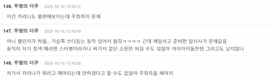 然而,也有粉絲為Karina抱不平,認為責任在主辦方,偶像一旦被點名就很難拒絕,真正不該的是把這個挑戰納入選項。