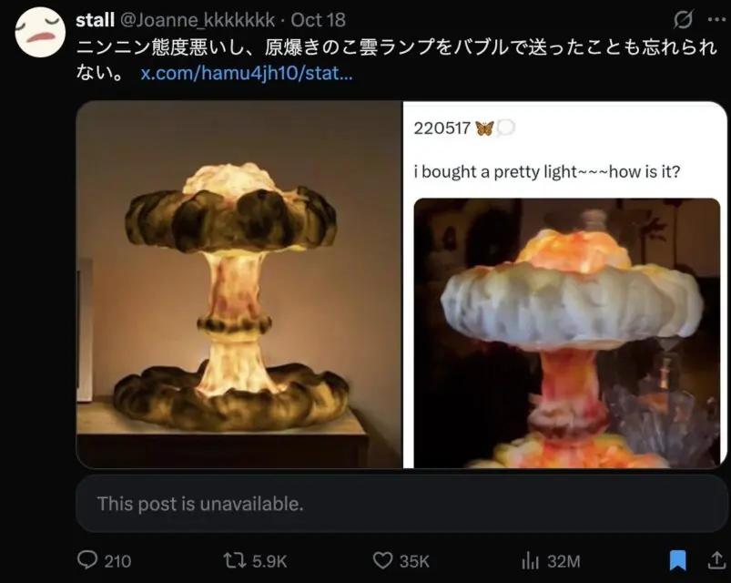@zaynsooprmngr表示 : “所以,1939年南寧大屠殺中對婦女的強暴,還有1940年代初在哈爾濱進行的部隊實驗對戰俘的拷打,都不被視為暴行,但擁有一盞長得像原子彈的檯燈,卻突然成了暴行嗎?”