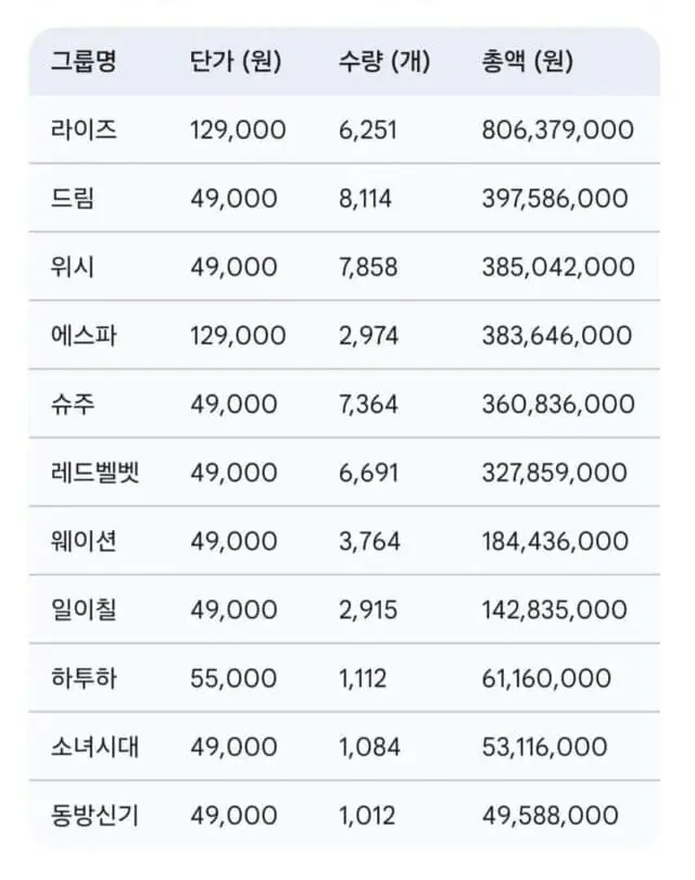 Red Velvet也有亮眼表現,售出6,691套,RIIZE則在定價較高的情況下仍賣出6,251套。aespa以2,974套居後,但因單價較高,總收入依舊可觀。