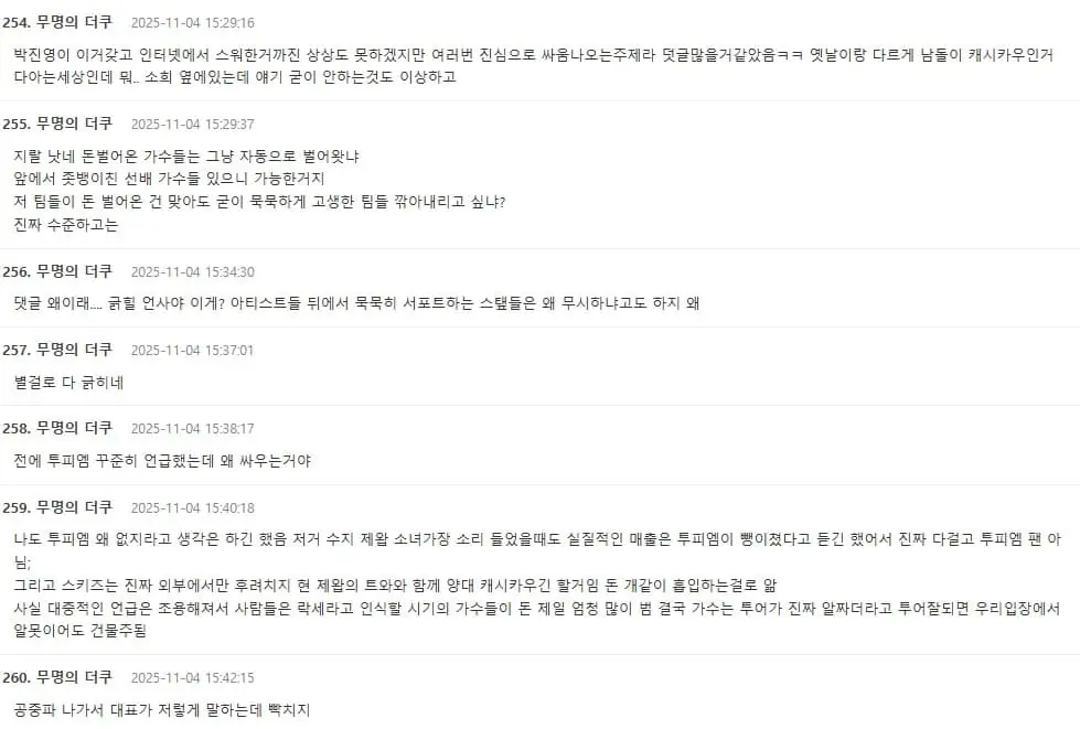 「朴軫永說了那番話,網路上就開始吵成一片。我雖然不確定他是不是特別在意收益、說得那麼露骨,但感覺留言很多都是拿「賺錢」來做文章,畢竟娛樂圈本來就是商業世界,站在公司旁邊這樣講也怪怪的。」「最近賺到錢的歌手,難道都是自動就會賺嗎?前面能有那些把路鋪好的前輩歌手才做得到吧。就算現在賺錢的是那些團,也不代表就可以把曾經辛苦的團踩下去吧?真的很低級。」