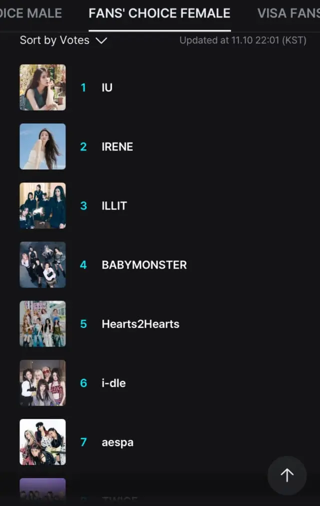這位出道第10年、去年才正式SOLO出道的Red Velvet隊長,於MAMA的「人氣獎」排名中位居女藝人第2位。她僅次於IU,將ILLIT、BABYMONSTER、aespa等更年輕的女團(或成員)甩在身後。