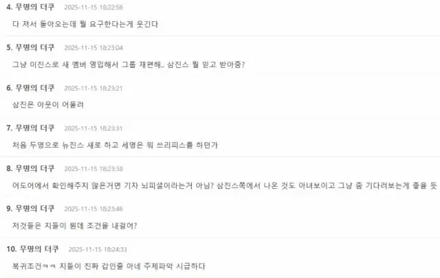 《文化日報》:「業界人士表示,ADOR與這三名成員在『應與閔熙珍保持多大距離』上存在明顯落差。亦有傳聞流傳三人希望閔熙珍回歸擔任製作人。當被要求說明時,ADOR回應稱『無法確認任何與回歸條件或協商相關的內容』。」
