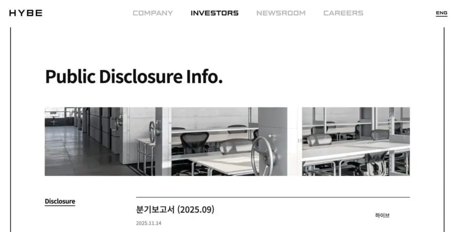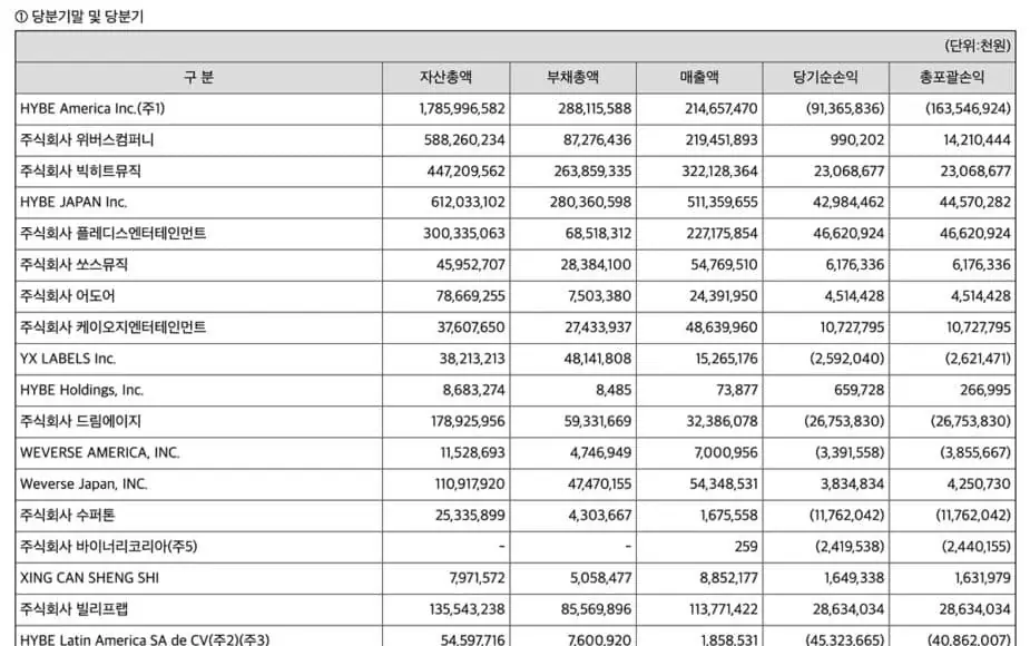 這份季報於2025年11月14日透過HYBE官方網站上的對外公示公開,其中包含一個「主要子公司財務摘要資訊」的章節,向投資人提供 HYBE 及其旗下廠牌的營運概況,其中包括BIGHIT MUSIC、PLEDIS娛樂、Source Music、ADOR和KOZ等公司。