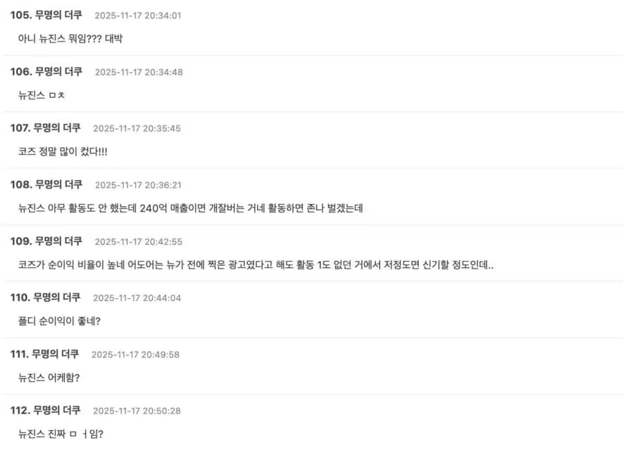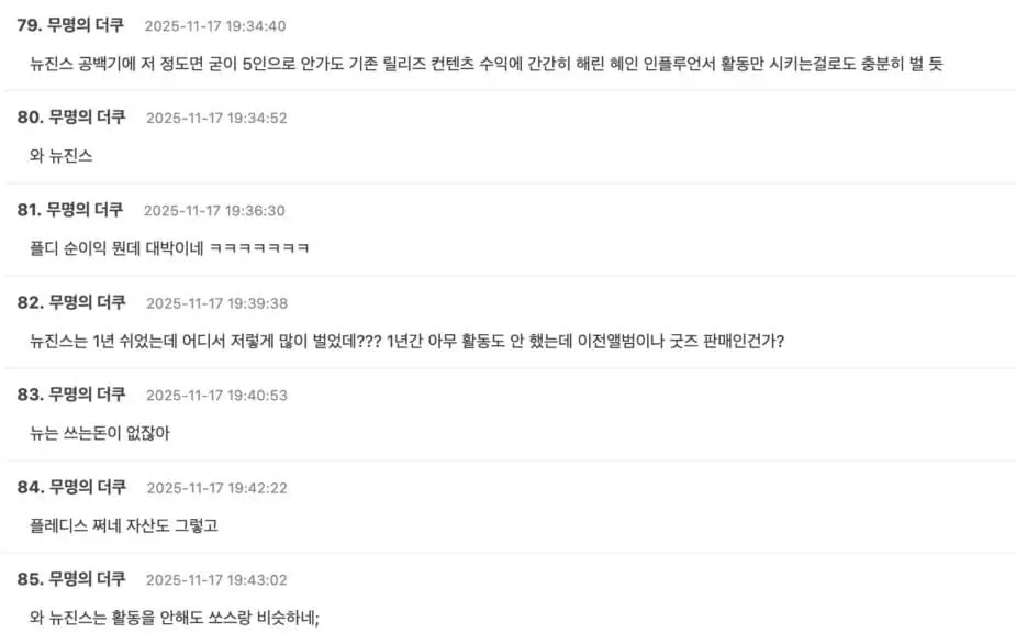 有些人指出,ADOR的淨利看起來比較高,只是因為NewJeans當時「事實上在休團中」,所以「沒有在花錢」。也有人反駁說,就算在醜聞期間,這個團體還是能持續創造收益,本身就證明了她們對公司有多關鍵,包括現在因「延遲回歸」而承受強烈輿論壓力的那三位成員。