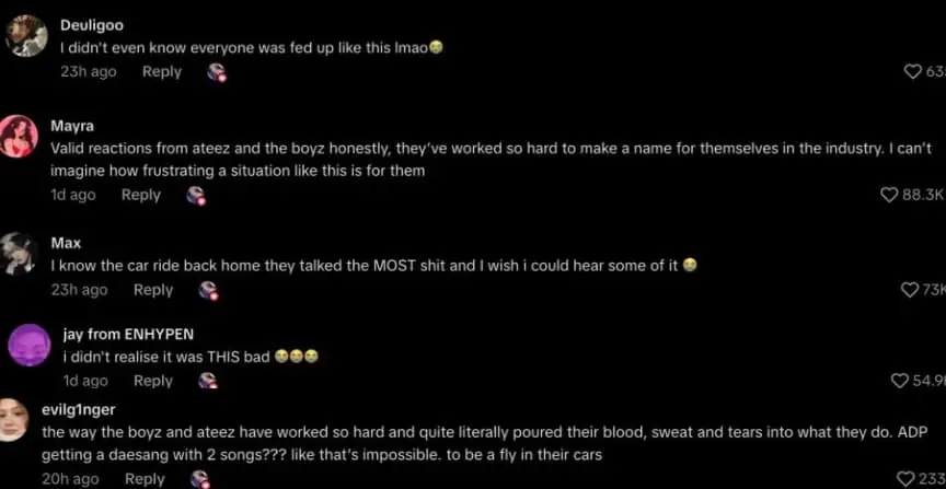 「老實說ATEEZ和The Boyz的反應很合理,他們為了在業界闖出名號付出了這麼多努力。我無法想像這種情況對他們來說有多令人沮喪。」