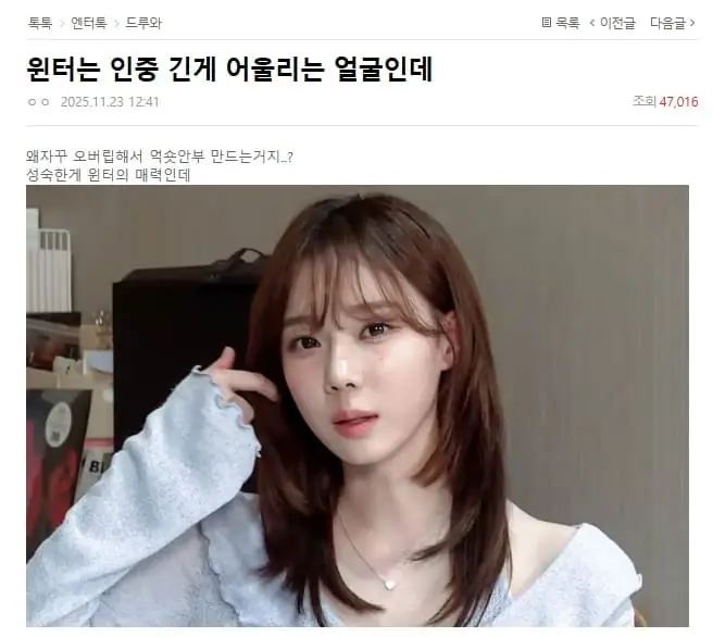 近期在Nate Pann上的一篇貼文累積超過4.7萬次瀏覽,網友們拿著Winter「有畫誇張唇線」與「沒畫唇線」的照片進行比較與討論。