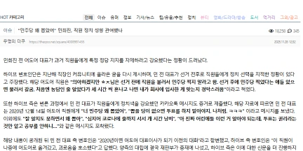 這則貼文是在ADOR成立前、約2020年12月左右所寫。一名職員發文表示:「有點疑惑,ㅎㅈ小姐(推測為閔熙珍)在選舉前會把職員叫去,說『不要投給民主黨』。還說選舉後如果有同事是投給民主黨的,就把那幾個人叫來給她。起初我以為是在開玩笑,但如果每個人都被罵3個小時,我就會懷疑自己當初進這間公司的決定到底對不對,震驚到不行。」