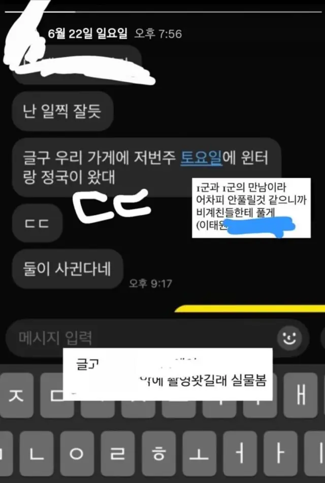 在相關傳聞持續發酵之際,網路上又出現了更多所謂的「證據」。其中一張正在粉絲之間瘋傳的截圖,是有人聲稱在6月時親眼看到柾國和Winter在一起。
