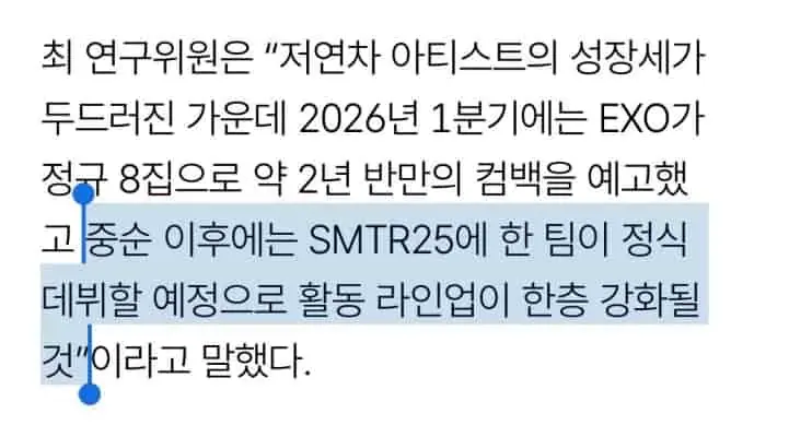 三星證券研究員崔玟河表示:「在低年資(新人)藝人增長勢頭明顯的情況下,EXO預計將於2026年第一季以正規八輯回歸,這也是時隔約兩年半的回歸。」「而在年中之後,預定會有一支來自SMTR25的團體正式出道,活動陣容將因此進一步強化。」