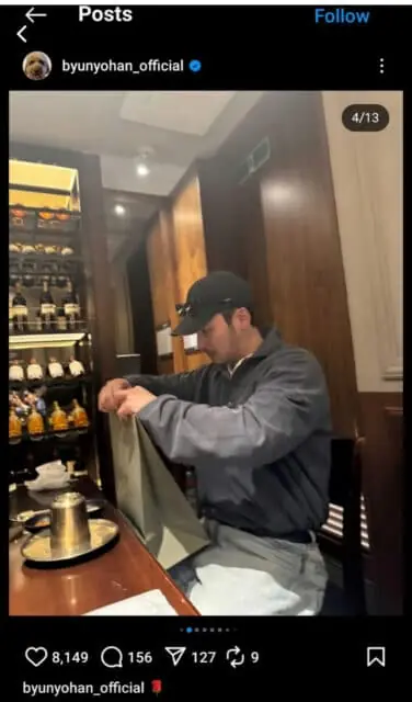 在卞約漢生日左右,他曾在Instagram上傳了好幾張照片,其中一張,剛好在他身後的鏡子裡出現了一個「很眼熟的倒影」。