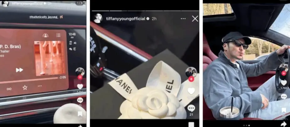 雖然光看那張照片,或許很難斷定鏡中的倒影是否就是Tiffany,但兩人社群帳號上其他被粉絲視為「證據」的線索,讓大家逐漸把拼圖拼起來——例如他們戴過同款棒球帽,或是有人目擊卞約漢坐在Tiffany的保時捷車上。