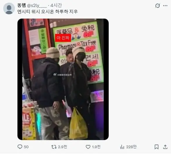 該篇(現已刪除的)貼文宣稱,文中附上的照片就是這兩位偶像。從背景來看,兩人似乎身在日本,可能是在唐吉訶德店外,並且戴著相似(或「同款」)的帽子。