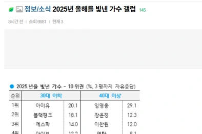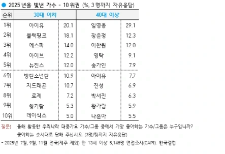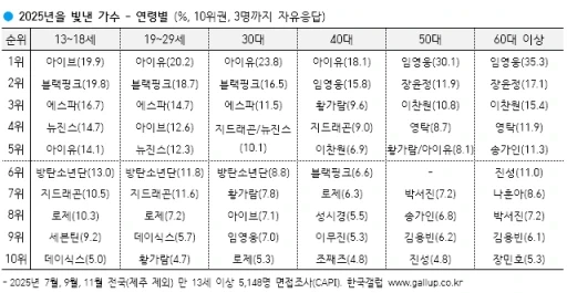 韓國蓋洛普依照年末慣例進行問卷調查,並公開了「2025年年度歌手」的調查結果。