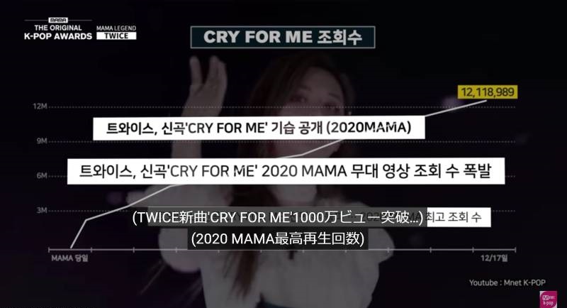 被稱為TWICE傳奇表演的就是2020年在「MAMA」上亮相的「CRY FOR ME」。2020年的「MAMA」受新型冠狀病毒的影響,無觀衆實施。雖然播放了事前拍攝的《MORE&MORE》、《I CAN’T STOP ME》、《CRY FOR ME》等3首歌曲的表演,但其中與TWICE概念180度不同的《CRY FOR ME》格外引人注目。
