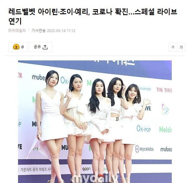 本月14日,韓國SM娛樂公司方面表示,旗下女團Red Velvet 成員Irene、JOY、Yeri被確診為COVID-19,成員康瑟琪和Wendy為陰性。原定於19日和20日舉行的演出將延期。