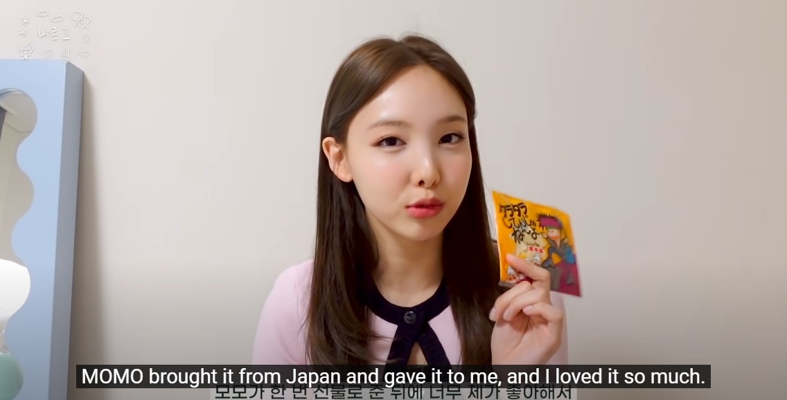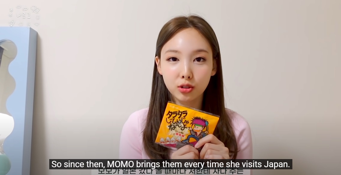 娜璉說:「說實話,不知道是什麼,是魷魚還是餅乾…」,雖然不知道原材料是什麼,但自從Momo送給我後,我就非常喜歡它。娜璉喜歡辣的食物,所以Momo就選擇這個~說不定是娜璉喜歡的味道。現在Momo每次去日本的時候都會給娜璉這個點心。
