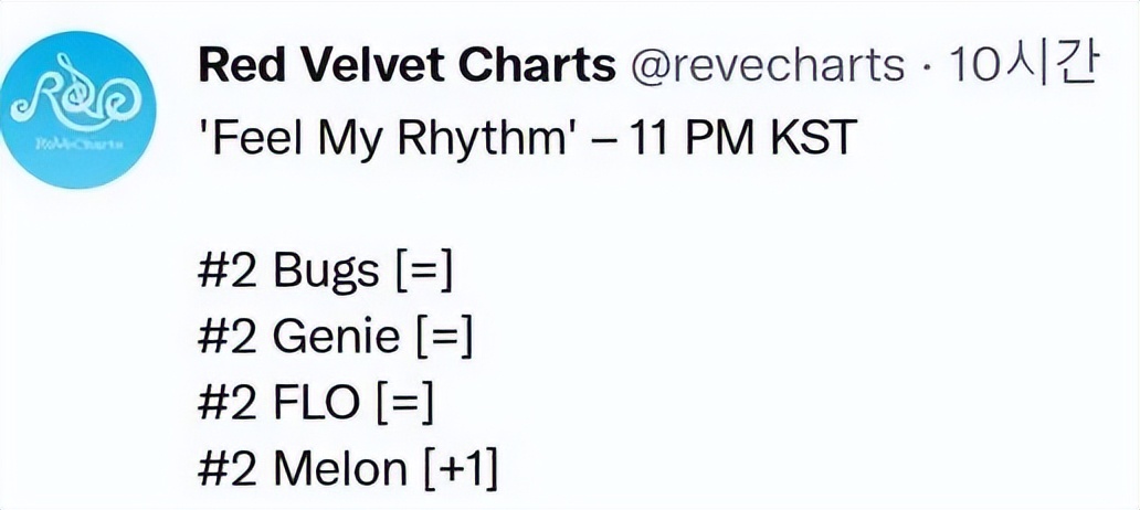 不只是專輯初期成績好,在音源榜單上,Red Velvet的《Feel My Rhythm》繼(G)I-DLE的《TOMBOY》之後排在第2位。