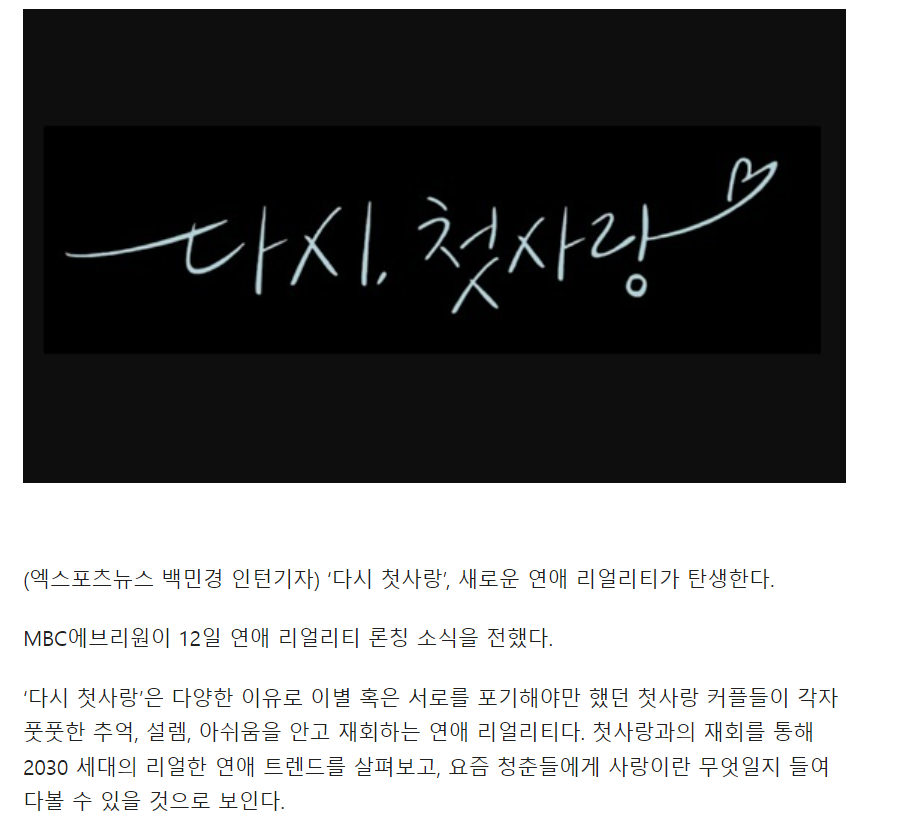4月12日,韓國三大電視台MBC對外宣布將推出全新的綜藝節目《再次初戀》,讓分了手的而初戀情人再續前緣!